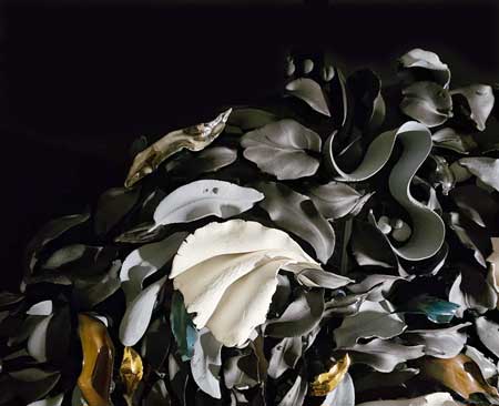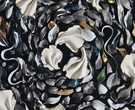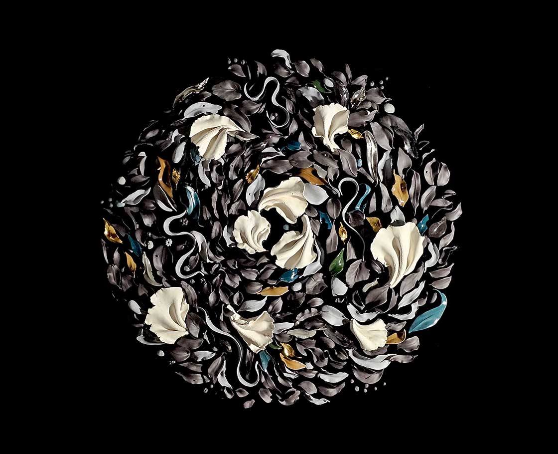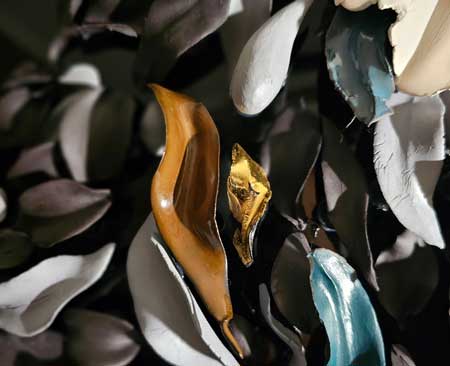 So this work has many small pieces. You have to touch them quite carefully. I’ll put your hand in the centre and you can move out from there. It’s on a shiny black glass surface, that you will feel later. The small pieces are made of two clays, one velvety and dark, the other fresh, strong and white. These are the small waves washing towards you.